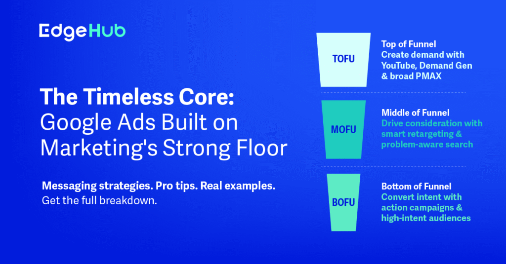 Here’s what most marketers miss: the specific campaign types, targeting methods, and the correct content strategy to apply for each segment of your funnel. For instance, YouTube Awareness Campaigns work differently than Search Campaigns for middle-funnel prospects. Performance Max requires different creative assets and audience signals depending on whether you’re targeting TOFU or BOFU.